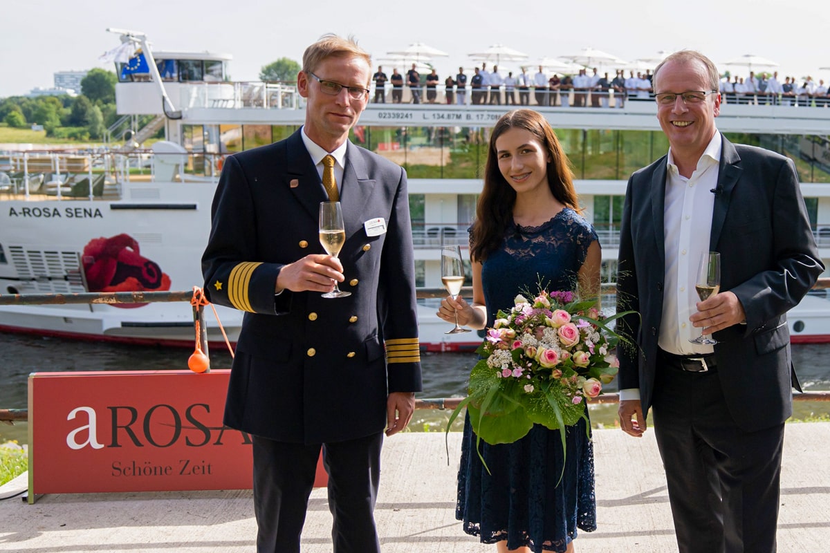 A‑Rosa Sena, das neue Flaggschiff von A‑Rosa ist nach wochenlanger Verzögerung am Wochenende zur ersten Reise ab Köln aufgebrochen. Zuvor wurde das Schiff in Düsseldorf von Clara Katharina Eichler, Tochter des A‑Rosa CEO Jörg Eichler, getauft.