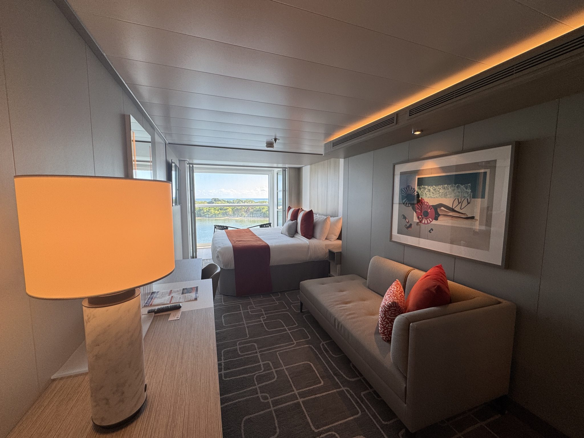 Wie schon auf den Schwesterschiffen gibt es auch auf der Celebrity Xcel die Infinity-Veranda-Kabinen. Der Balkon ist hier quasi im Raum integriert – ohne Balkontür oder Schwellen. Stattdessen kann ein Teil der Fensterfläche heruntergefahren werden und sorgt so für die gleiche Atmosphäre wie auf einem Balkon. Das Fenster ist durch eine absolut blickdichte Jalousie komplett lichtdicht abzudunkeln.