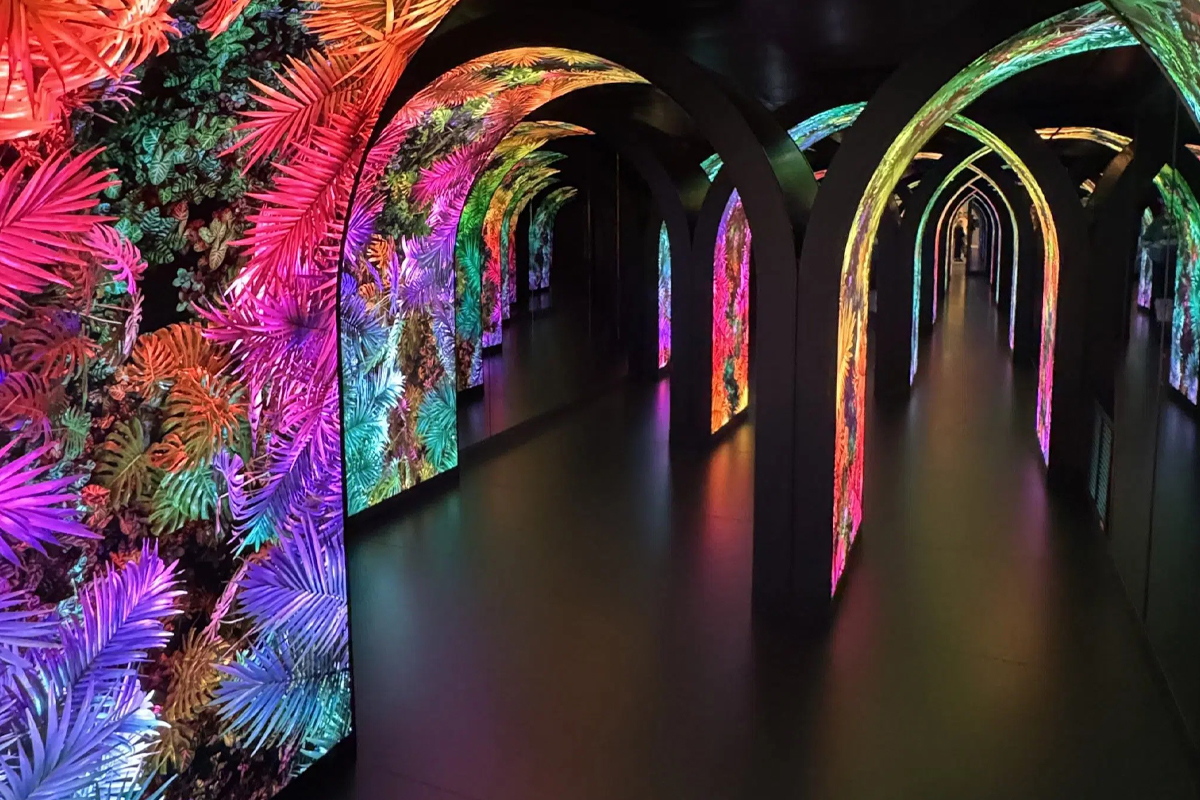 Futuristisch: Von einer Unterwasserwelt bis zu Palmenblättern ist der Zugang zum „Bazaar“ ein „Tunnel“ aus LED-Walls.