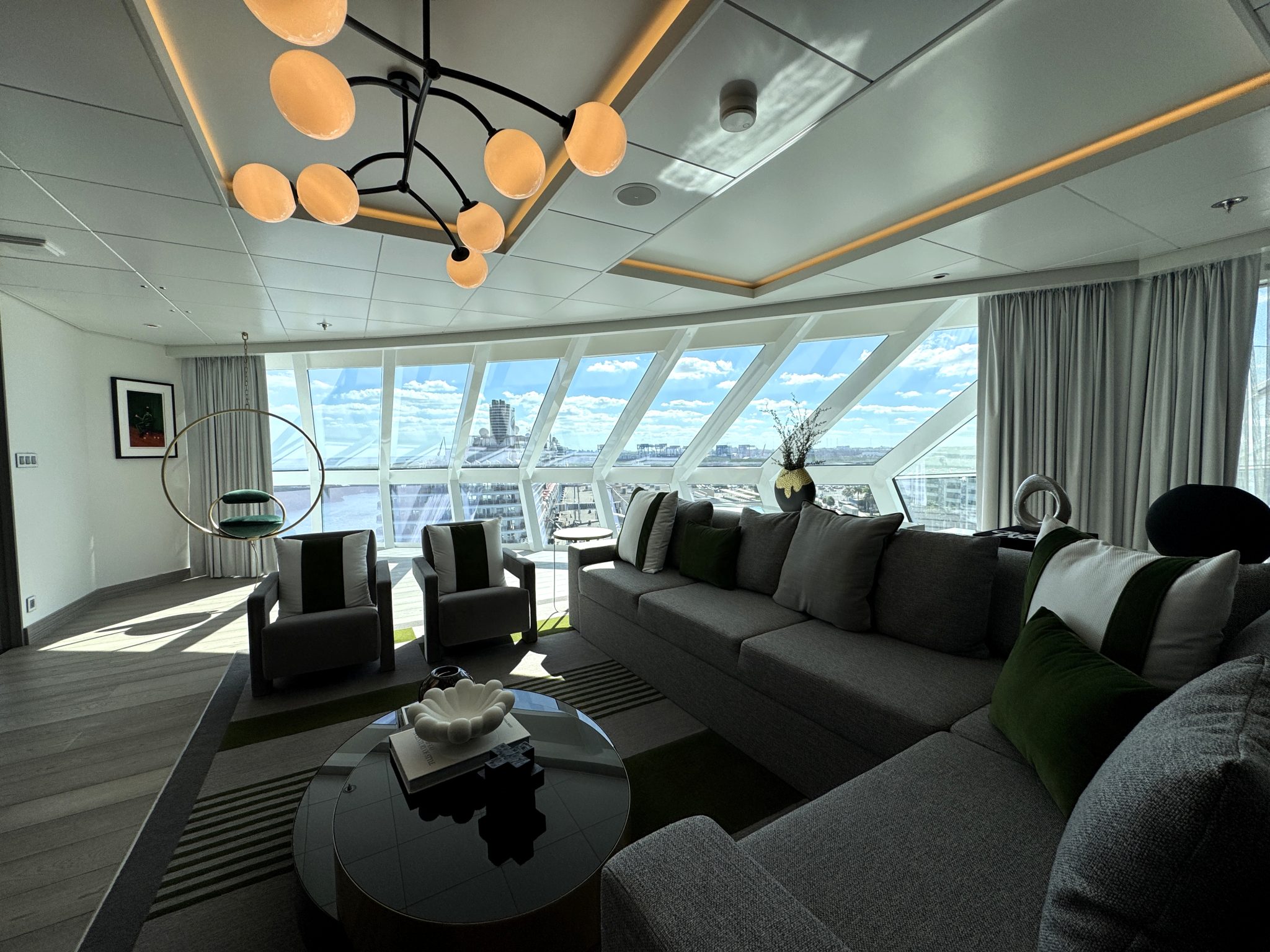 An Backbord und Steuerbord oberhalb der Brücke erstrecken sich die beiden beeindruckendsten Suiten auf der Celebrity Xcel: Die Iconic Suites. Auf 176 Quadratmetern erstrecken sich mehrere Schlafzimmer, Wohn- und Essbereich sowie Wellness-Bäder und ein Balkon mit Whirlpool und Sonnenterrasse.