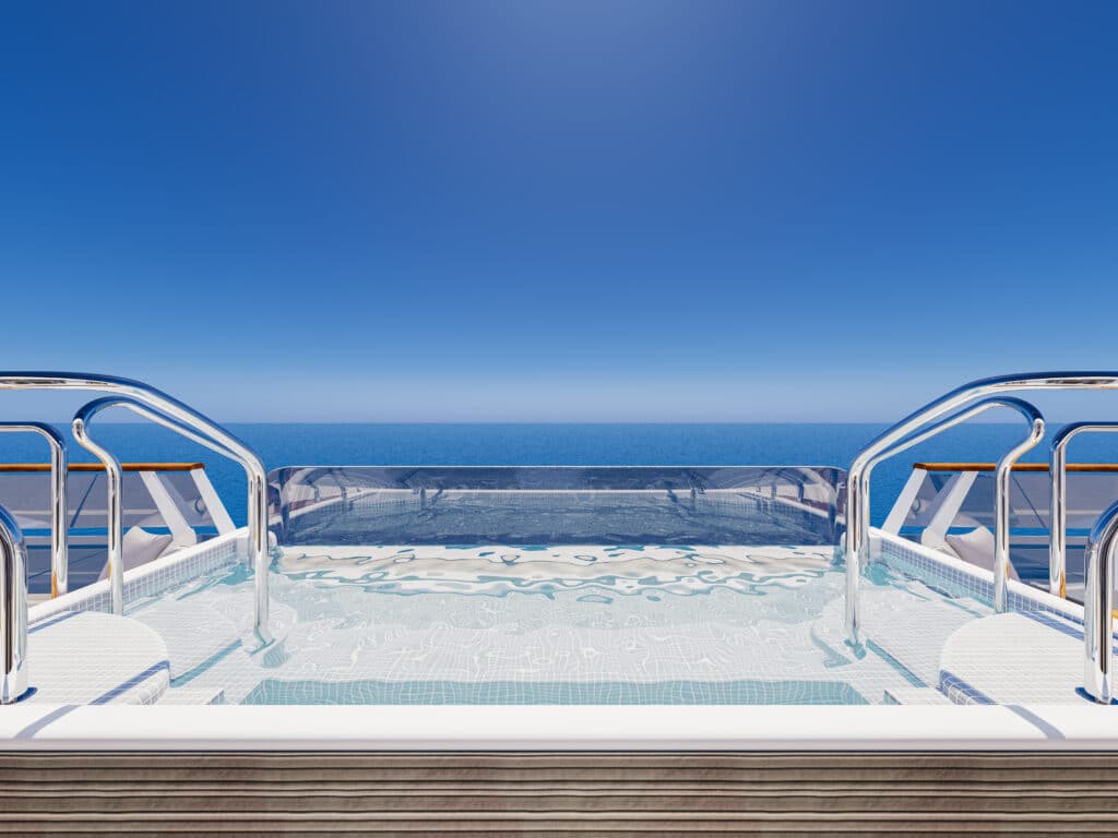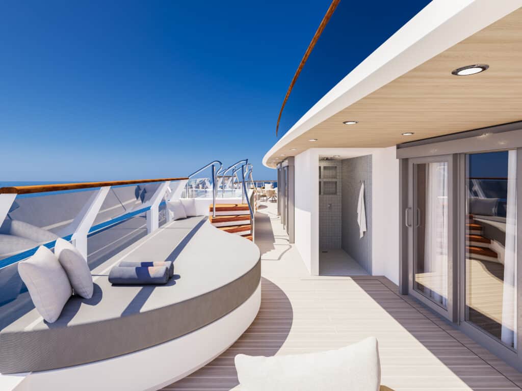 Von der pri­va­ten Außen­ter­ras­se, die über die vol­le Brei­te des Schiffs reicht, genie­ßen die Gäs­te einen fan­tas­ti­schen Pan­ora­ma­blick auf das Meer.