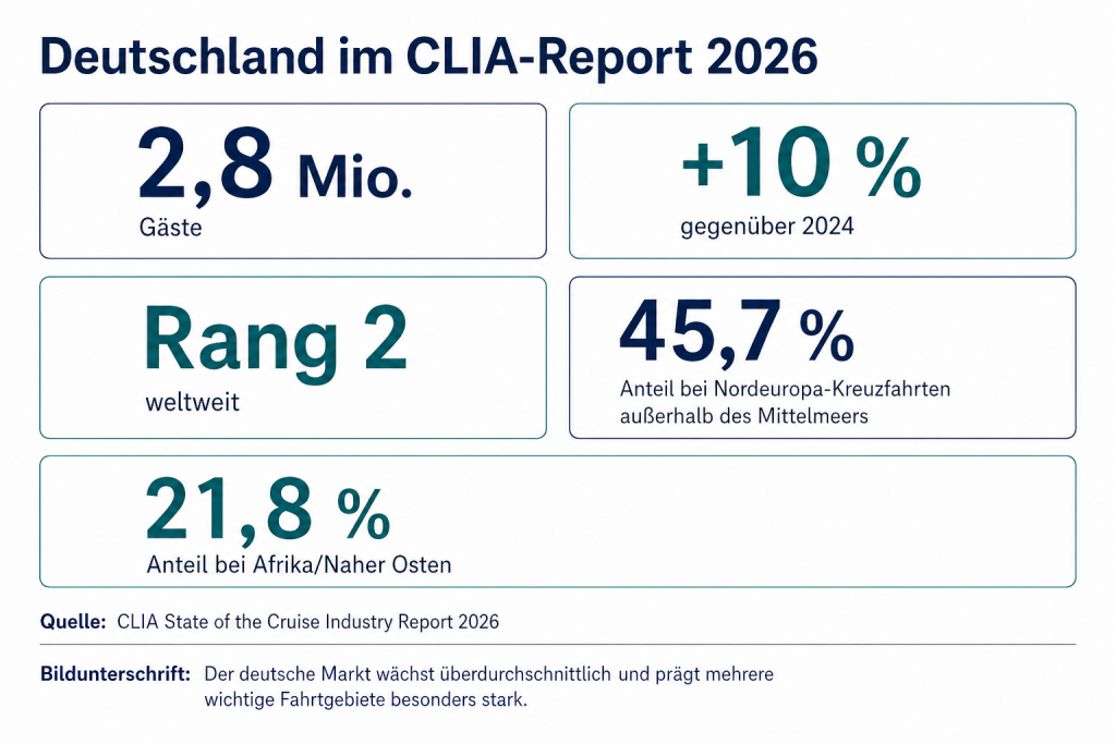 Dieser Wert ist allerdings als Momentaufnahme vor der jüngsten Eskalation im Nahen Osten zu lesen: Für 2026 dürfte die Entwicklung in dieser Region wegen des Iran-Kriegs, veränderter Sicherheitslagen und möglicher Routenanpassungen nur eingeschränkt mit dem Vorjahr vergleichbar sein. Für deutsche Gäste bleibt der Befund dennoch relevant, weil starke Nachfrage in der Regel mehr Auswahl bei Routen, Abfahrtsterminen, Schiffen und Preismodellen ermöglicht.