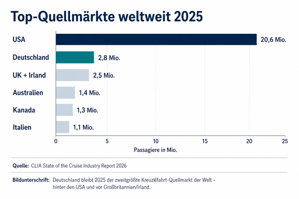 37,2 Millionen Menschen haben 2025 weltweit eine Hochseekreuzfahrt unternommen. Besonders stark zeigt sich der deutsche Markt: Mit 2,8 Millionen Passagieren liegt Deutschland international auf Rang zwei – hinter den USA und vor Großbritannien/Irland, Australien, Kanada und Italien.