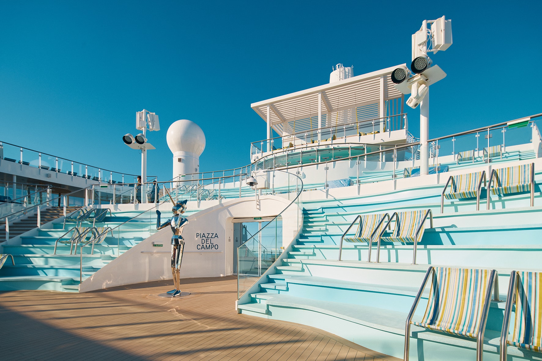 Ein wei­te­rer groß­ar­ti­ger Ort an Bord der Cos­ta Tos­ca­na ist der Well­ness­be­reich Sole Mio mit einem Beau­ty-Salon, einer Sau­na, einem Ham­mam, einem Thalas­so­the­ra­pie-Pool, 16 Behand­lungs­räu­men sowie Schnee‑, Salz- und Ent­span­nungs­räu­men. Zum Ent­span­nen und Son­nen­ba­den gibt es außer­dem vier Swim­ming­pools, von denen einer mit Salz­was­ser gefüllt ist. Wer sich auch in den Feri­en fit hal­ten möch­te, kann auf ein Fit­ness­stu­dio und einen Mul­ti­sport­be­reich mit Meer­blick zäh­len. Das Fit­ness­stu­dio ist mit den neu­es­ten Tech­no­Gym-Gerä­ten aus­ge­stat­tet, die ein ein­zig­ar­ti­ges und abwechs­lungs­rei­ches Erleb­nis bie­ten.