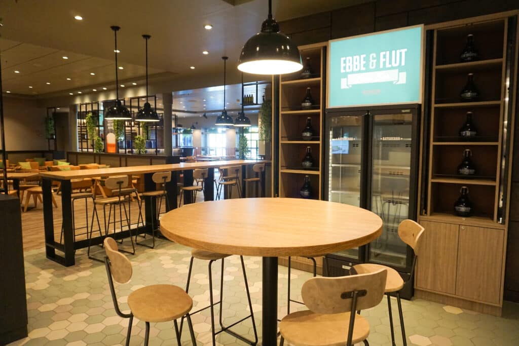 Im industriellen Design, mit zahlreichen Holz- und Kupferelementen, präsentiert sich nun die Ebbe & Flut Bier Bar. In Kooperation mit der Hamburger Ratsherrn Brauerei liegt der Fokus zukünftig auf regional gebrauten Bieren. In der Ebbe & Flut Bar wird ein Speisenangebot mit Gerichten aus dem „Altes Mädchen Ratsherrn Braugasthaus“ in Hamburg serviert.