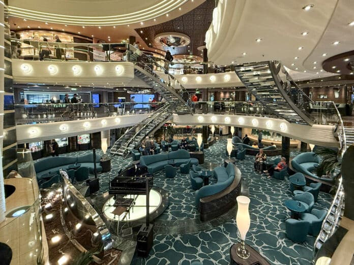 Schon beim Betreten des Schiffes wird klar: Wir sind auf einem Schiff von MSC Cruises. Im Atrium empfängt uns eine Treppe mit funkelnden Swarovski-Kristallen. Viel Chrom, Glas und italienisches Design in warmen Farben und organischen Formen prägen die MSC Preziosa.