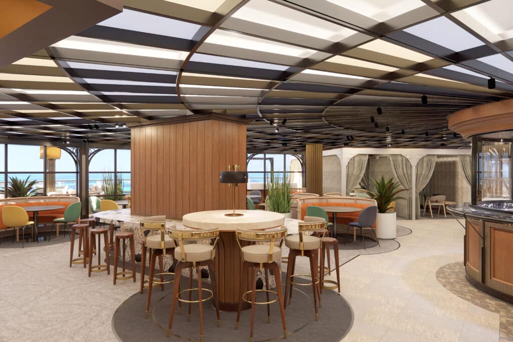 Die Metropolitan Bar, die Sail & Sustain-Cocktailbar, unterscheidet sich optisch auf dem Neubau deutlich von den anderen Schiffen der Prima-Klasse. Sie wurde von der Schiffsmitte auf das Heck von Deck sieben verlegt und verfügt nun über einen Flügel und einen kleinen Showbereich, wo die Gäste Live-Musik zu ihren Sail & Sustain-Cocktails, biodynamischen Weinen und nachhaltig produzierten Spirituosen genießen können. Inspiriert von den Art-déco- und Mid-Century-modern-Vierteln von New York City hat das Studio DADO einen intimen Wohlfühlort mit dunklen Farbtönen, auffälligen Motiven und frischem Grün geschaffen.