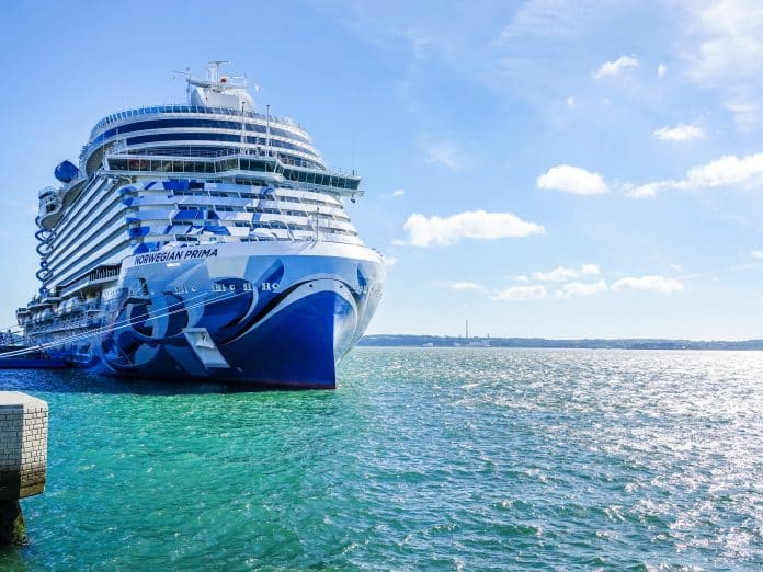 Durch die auffällige Bugform und expressive Bemalung ist die Norwegian Prima ein Hingucker, wie hier im Hafen von Amsterdam. Die Rumpfbemalung wurde vom italienischen Graffiti-Künstler Manuel Di Rita entworfen und erstreckt sich auch über die vorderen Aufbauten des Schiffes.