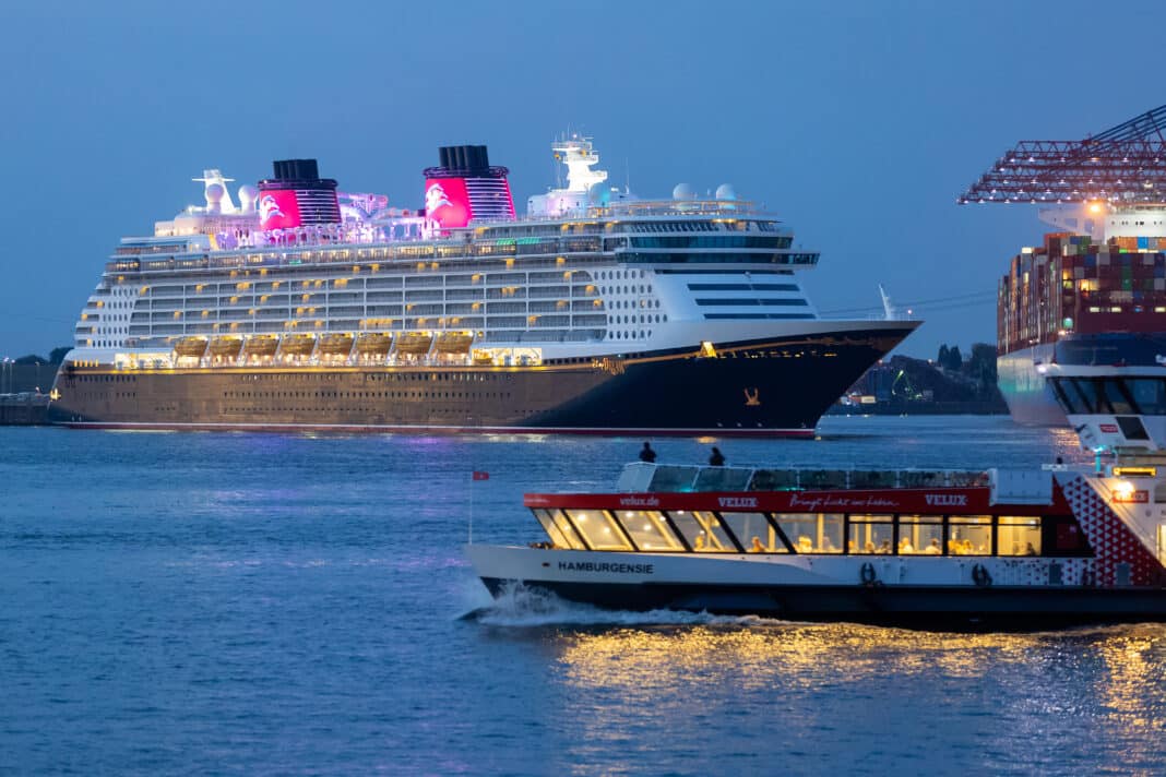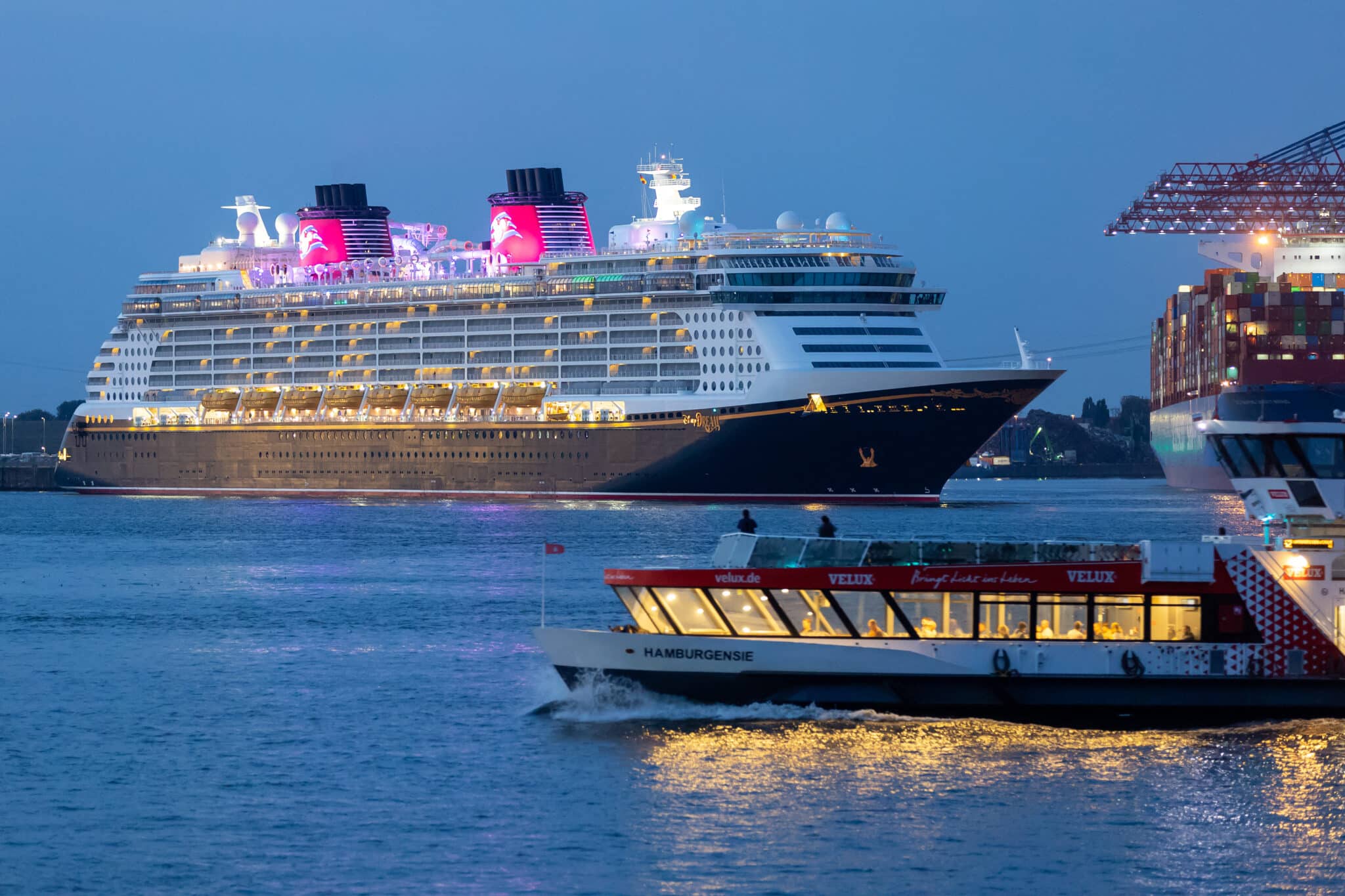 Ges­tern, am 3. Sep­tem­ber 2024, mach­te die „Dis­ney Dream“ zum ers­ten Mal am Ham­bur­ger Crui­se Ter­mi­nal Stein­wer­der fest. Das Schiff der Ree­de­rei Dis­ney Crui­se Line befin­det sich auf einer sie­ben­tä­gi­gen Rei­se von Sout­hamp­ton nach Ham­burg sowie See­brüg­ge. Am Mitt­woch­abend, 4. Sep­tem­ber 2024, soll der Crui­se­li­ner gegen 18 Uhr wie­der able­gen. Die Aus­fahrt wird von Bar­kas­sen beglei­tet.