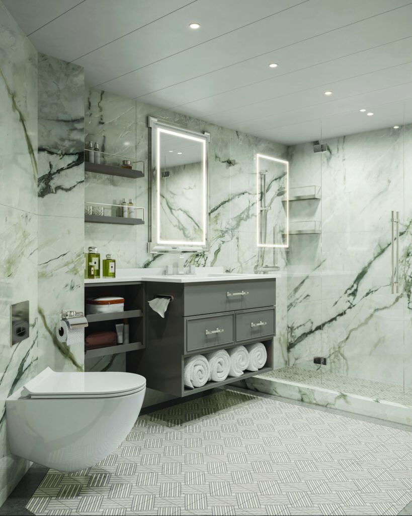 Konkret erhalten Suiten und Kabinen neue maßgefertigte Möbel, neue Stein- und Holzdekore sowie neue Designer-Accessoires. Geschwungene Tische und Stühle, Beleuchtung und Holzarbeiten erledigen der Mitteilung zufolge europäische Handwerksfirmen. Die Badezimmer an Bord von Marina und Riviera schimmern künftig „perlmuttartig“, bekommen glitzernde Armaturen mit gräumigen Stauräumen und überdimensionale Duschen.