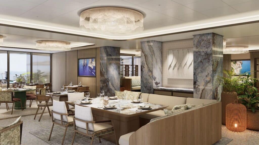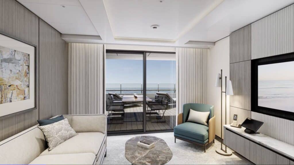 Jede der insgesamt 224 Suiten an Bord verfügt über raumhohe Fenster und eine private Terrasse. In den Suiten kontrastieren zarte Farbtöne mit tiefreichenden Texturen und warmer Beleuchtung. Jede Suite ist so konzipiert, dass sie sowohl Ruhe als auch Vielseitigkeit bietet sowie eine Vielzahl von Funktionen erfüllt, je nach den Vorlieben der Gästen.