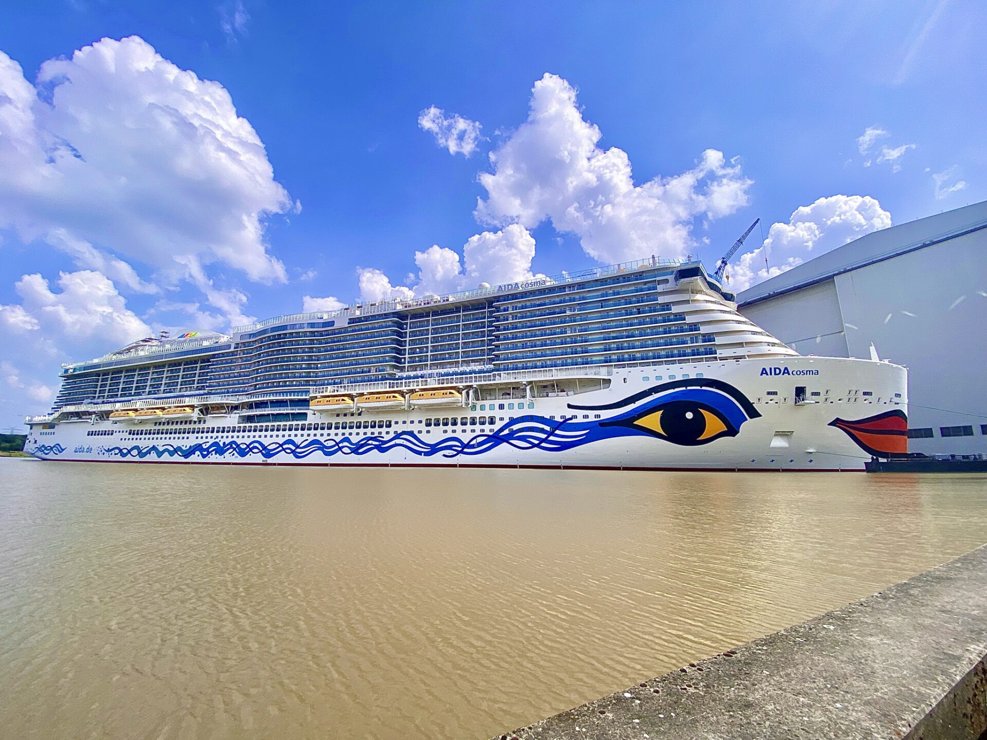 Unter der Beob­ach­tung vie­ler Aida Fans und Face­book-Live­strea­mer wur­de heu­te mor­gen die Aida Cos­ma aus dem Bau­do­ck der Mey­er­werft gezo­gen. In der ver­gan­ge­nen Woche wur­den als letz­te gro­ßen tech­ni­schen Instal­la­tio­nen der aktu­el­len Bau­pha­se die Schiffs­schrau­ben mon­tiert.