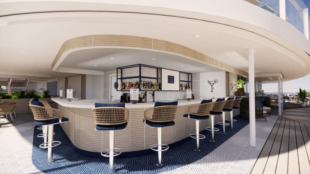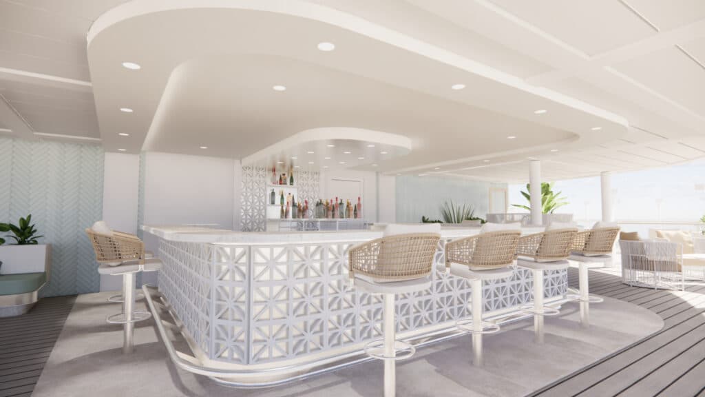 Neben verschiedenen inkludierten Bars auf den Außendecks und im Innenbereich, gibt es einer Ankündigung der Reederei zufolge drei neue Highlights, die Drink-Kultur auf ein neues Level heben sollen. In bester Lage laden demnach Loungemöbel und ein großes Angebot an inkludierten Getränken in der am Heck höchstgelegenen, weitläufigen Outdoor-Bar ein. Dieser Bereich ersetzt offenbar die von den übrigen Schiffen bekannte Außenalster-Bar.