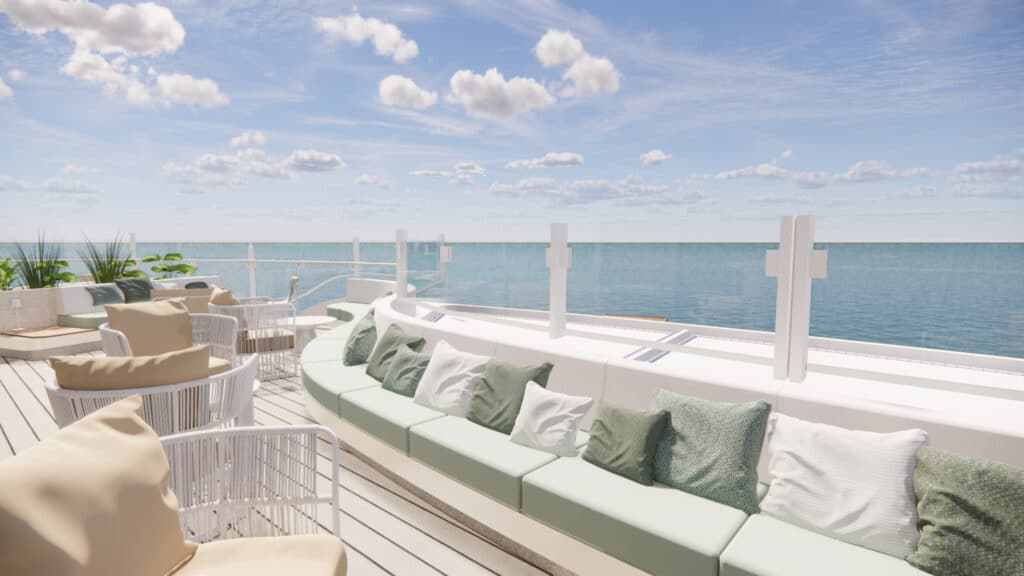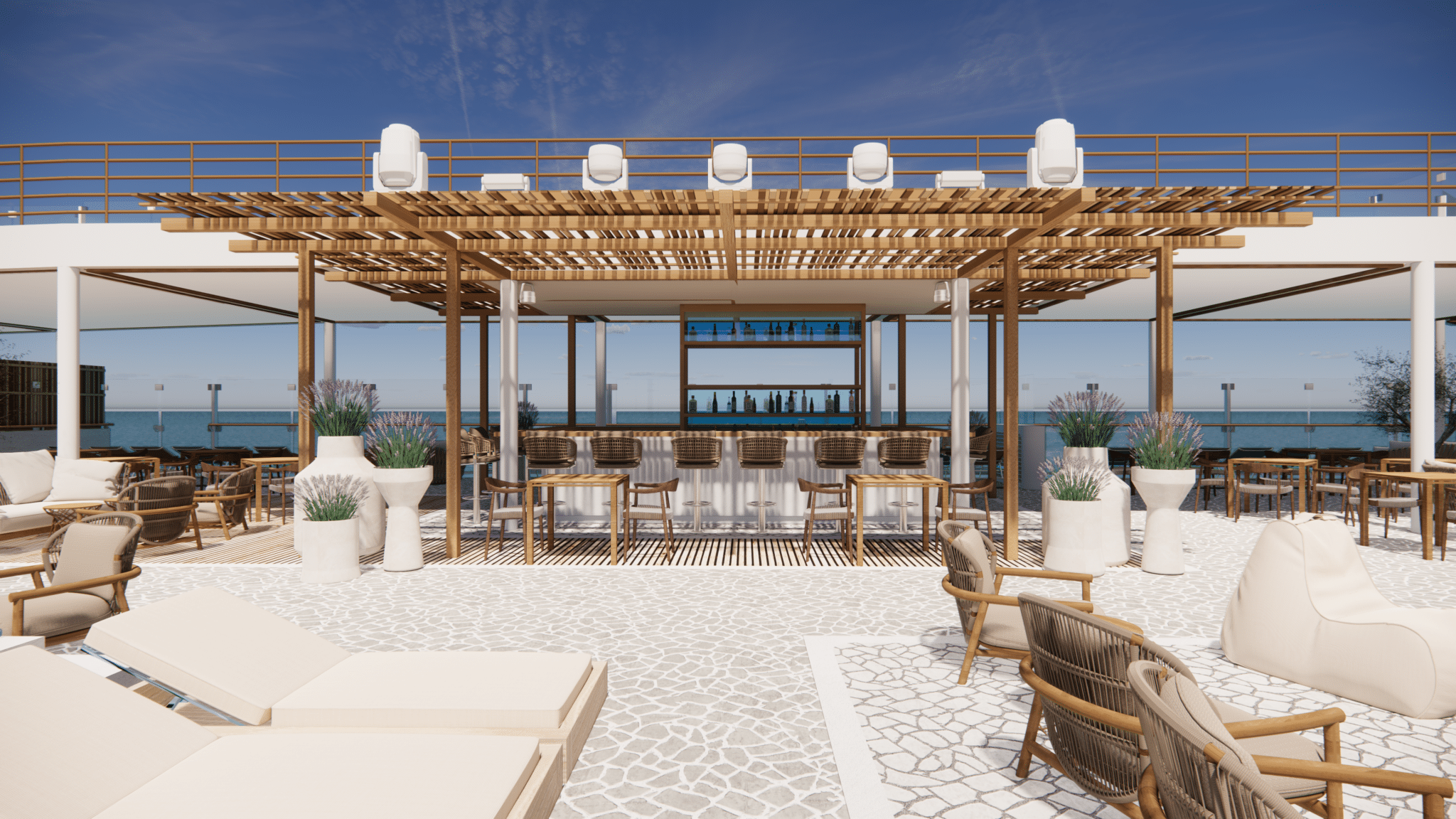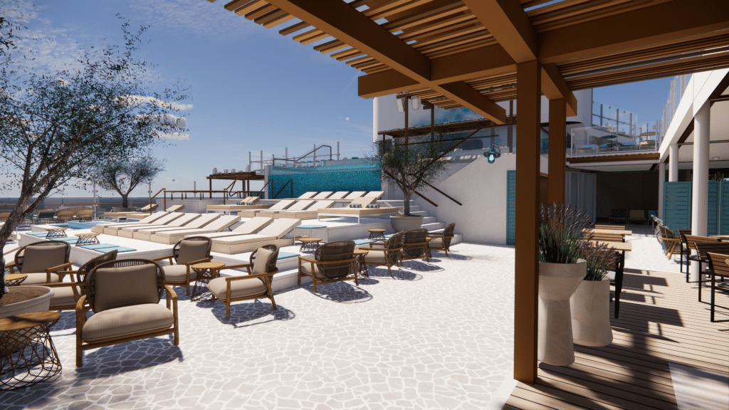 Neu konzipiert sind die offenen Decks des achten Schiffes. Schon weithin sichtbar ist das neue, charakteristische Dach über Teilen des 25-Meter-Pools und der Sonnenbereiche. Das Heck des neuen Schiffstyps ist im Vergleich zu den bisherigen Flottenmitgliedern von TUI Cruises komplett überplant worden. Eine terrassenförmige Sonnen-Landschaft und der Infinity Pool sollen hier für Entspannung sorgen.